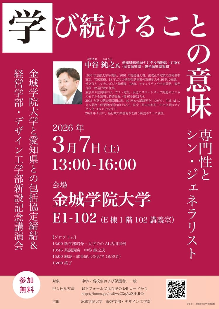 これを記念し、3月7日(土)に本学キャンパスにて中谷純之氏(愛知県総務局デジタル戦略監(CDO))をお迎えした特別講演会を開催します。