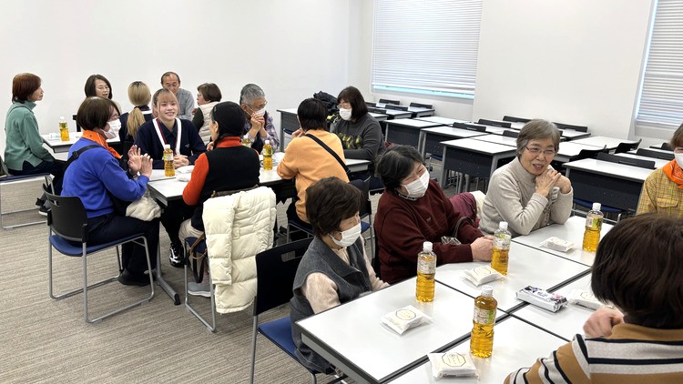 体を動かした後は、学生と参加者の皆さんでカフェタイム。各テーブルから楽しそうな笑い声や会話が聞こえ、和やかな交流のひとときとなりました。