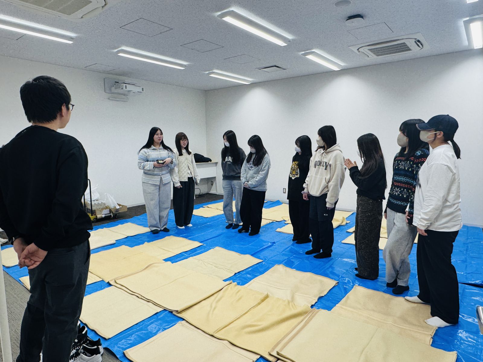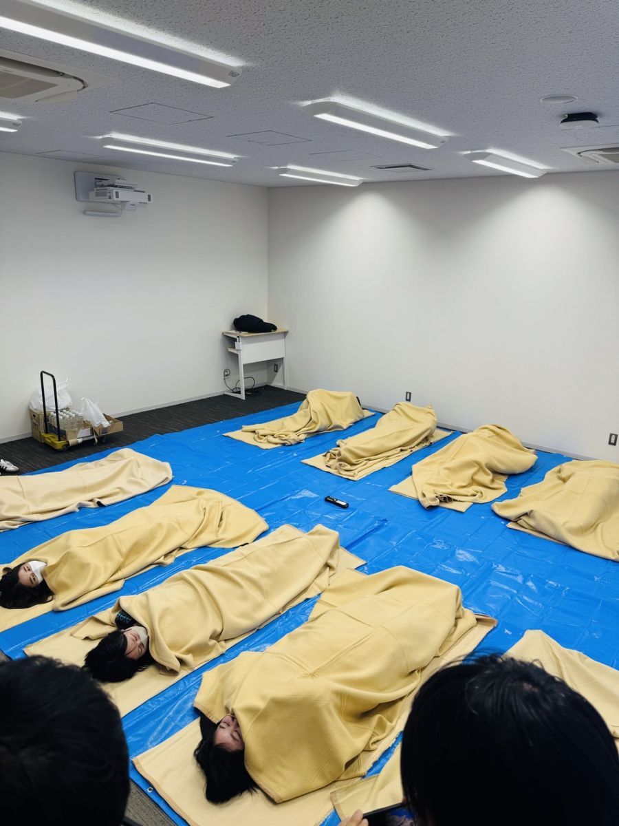 夕食はアルファ化米。実際に作って食べてみると「意外とおいしい!」という声も。就寝時はブルーシート+毛布のみ。硬い床、寒さ、プライバシーの不安…。体験して初めて分かる課題がありました。