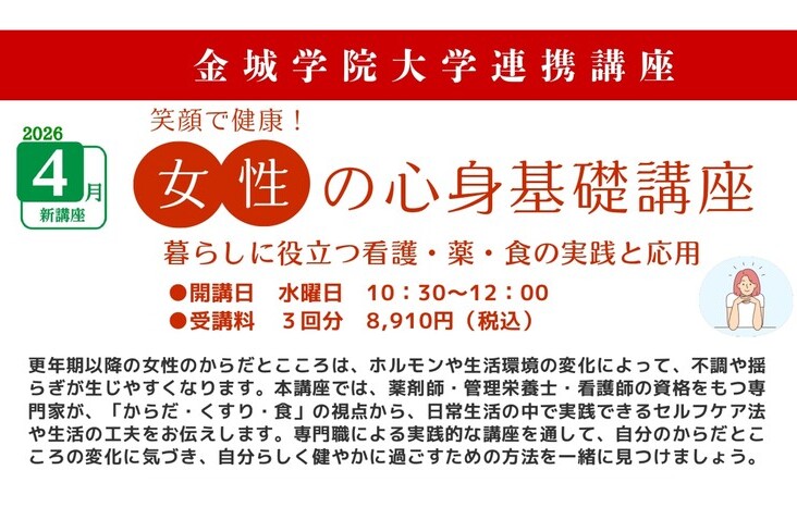 【連携講座】1~3月開催 女性の心身基礎講座-暮らしに役立つ看護・薬・食の実践基礎-