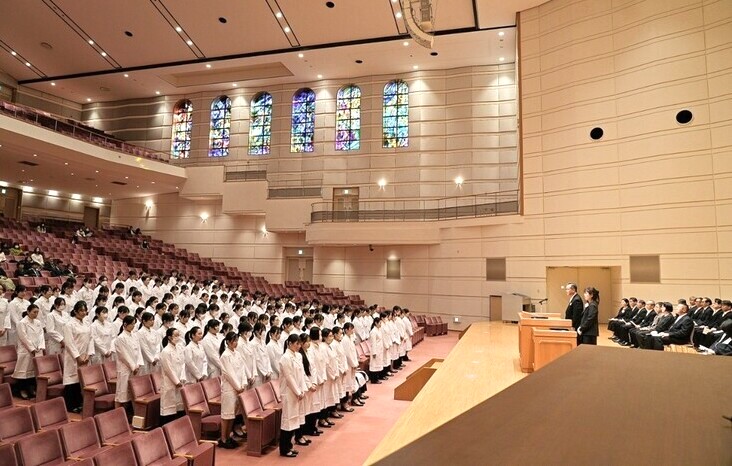 - 1年次から調査・討論・発表などグループ学習を実施し、医療現場で通用する問題解決能力を養います。1年生のグループ討議の授業に2年生が参加し進行をサポートする独自の授業スタイル「屋根瓦方式」を採用し、学んだことを分かりやすく伝える力を磨きます。