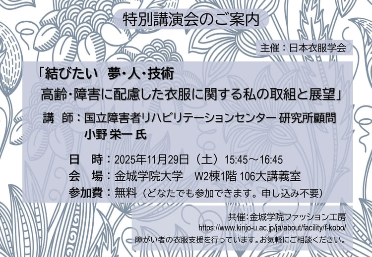 2025年11月29日(土)にW2-106で、日本衣服学会主催の一般公開講演会が開催されます。