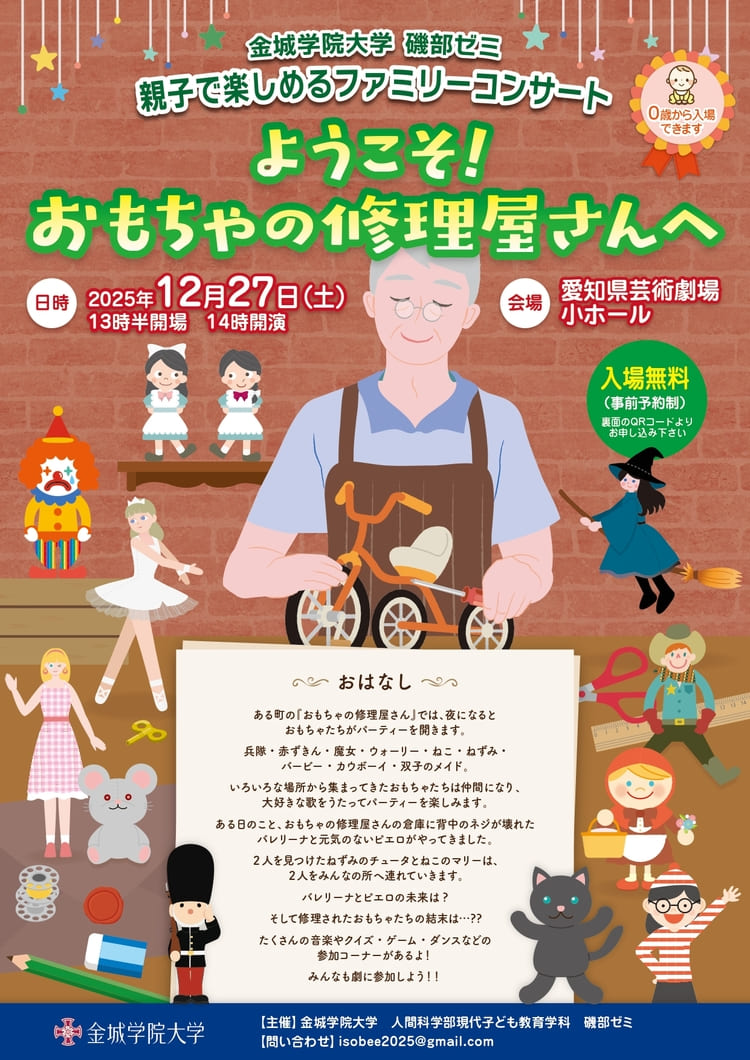 人間科学部 現代子ども教育学科 磯部澄葉ゼミでは音楽劇制作に取り組んでおり、2025年12月27日(土)愛知県芸術劇場 小ホールにてファミリーコンサートを開催します。