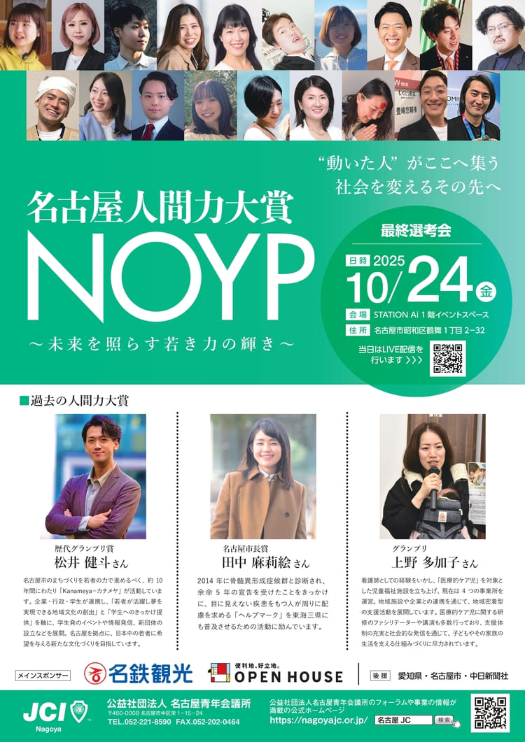 最終選考会は10月24日(金)18:00よりSTATIO Ai(鶴舞)にてスピーチコンテスト形式で開催され、名古屋を拠点に社会を変え、未来を担う活動に取り組む10名がそれぞれ4分間のスピーチを行います。
