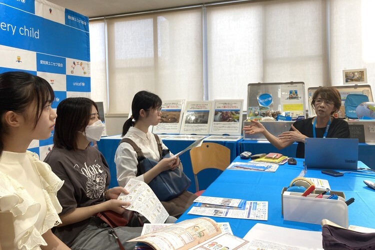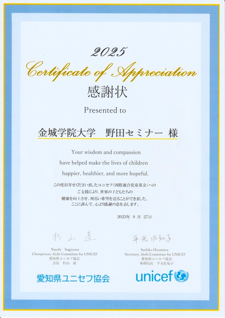 寄付にあたり、野田セミナー代表の学生が本山駅前にある愛知県ユニセフ協会を訪問し、事務局長の平光佐知子様から感謝状をいただきました。さらに平光様からは、今も紛争が続くガザやウクライナの子どもたちの現状、そして毎日8時間かけて水を汲みに行かざるを得ないアフリカの少女の生活についてお話を伺い、子どもの権利条約40について学びました。