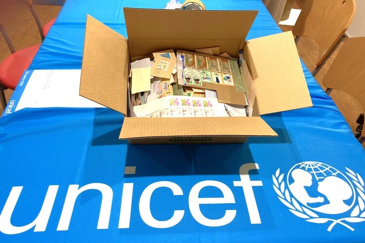 この使用済み切手は、本学に届いた郵便物から集められたもので、野田セミナーの学生が仕分け作業を担当しました。集められた使用済み切手は切手収集家を通じて換金され、世界の子どもたちを支援するユニセフの活動資金として役立てられます。