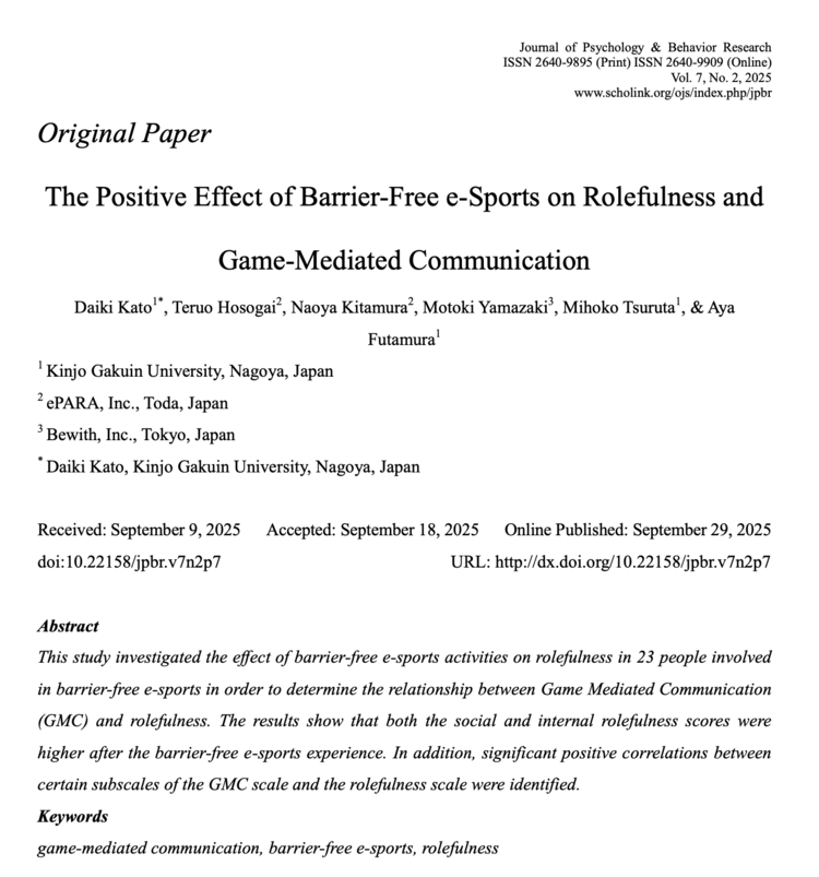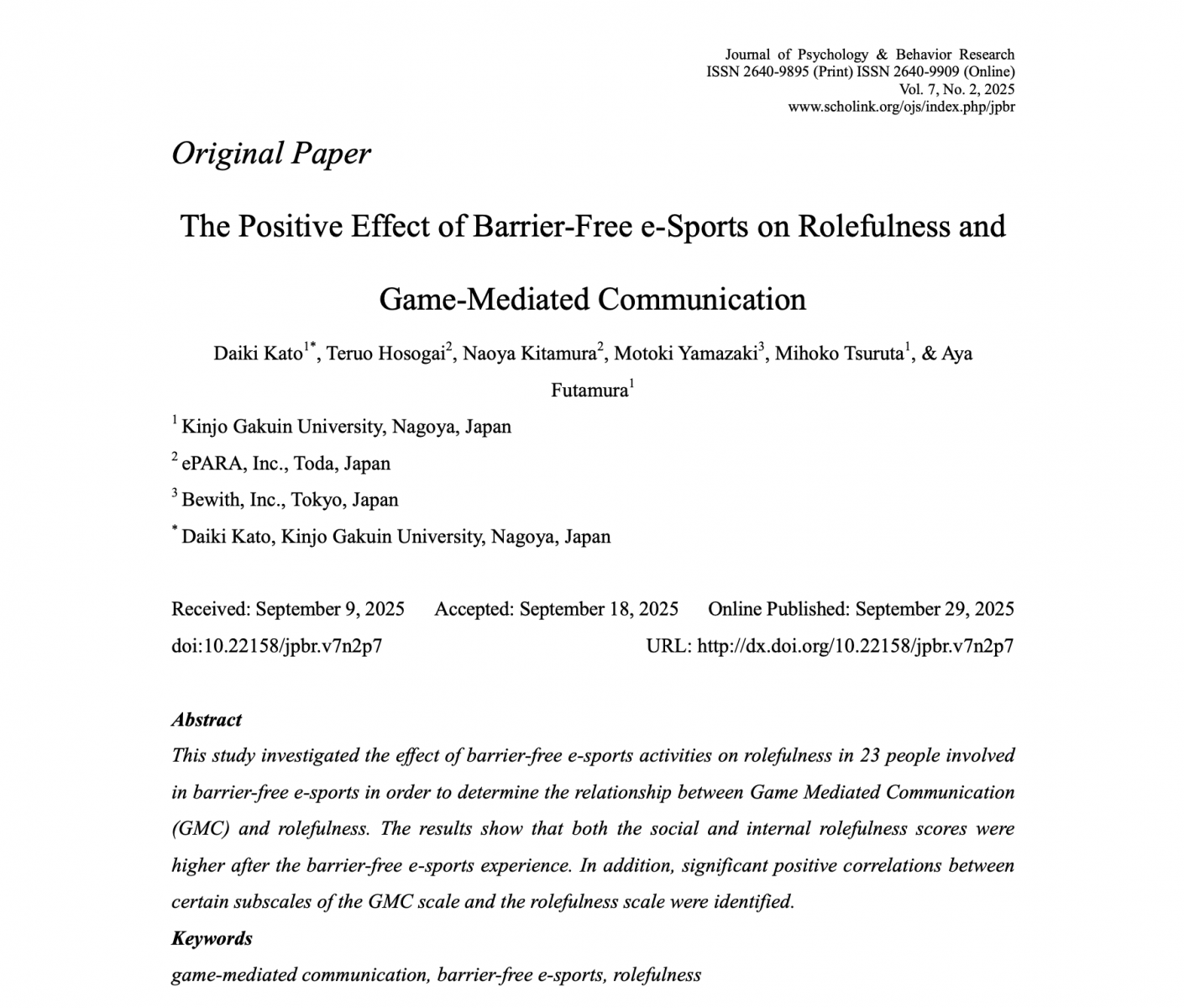 研究チームでは、加藤教授らが開発した、デジタルゲームを通じた心理的交流を測定する尺度を活用し、バリアフリーeスポーツに携わる人たちの心理的成長のプロセスを明らかにしました。