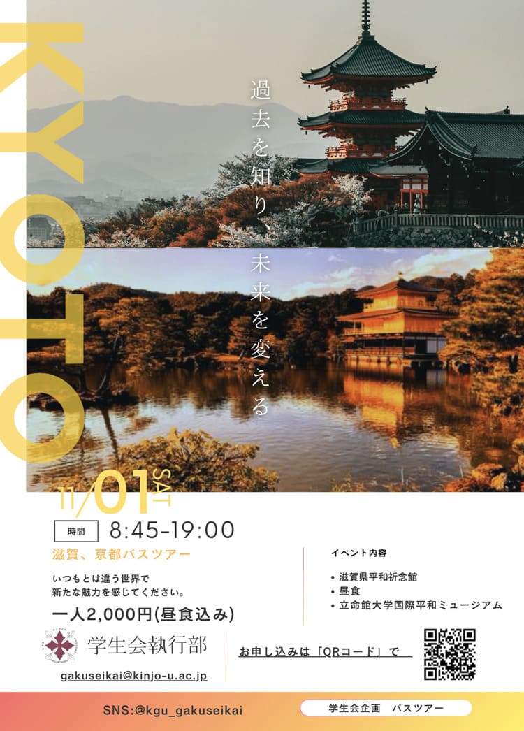 ただいま学生会では、楽しみながら平和について考える、滋賀、京都バスツアーの参加者を募集しています。 ■ツアー詳細 【日時】 2025年11月1日(土) 8:45~19:00 【イベント内容】 ・滋賀県平和祈念館 ・昼食 ・立命館大学国際平和ミュージアム 【対象】 金城学院大学の学部生 【参加費】 2,000円 美味しい昼食(和食)付です! 【申込】 こちらからお申込みいただけます