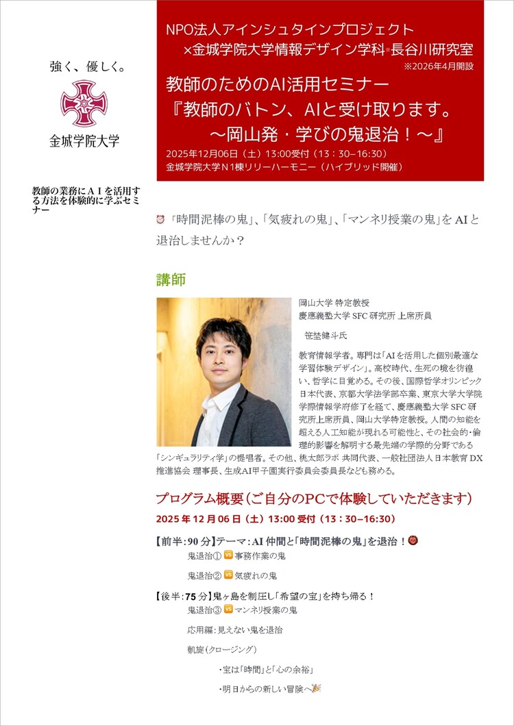 教師のためのAI活用セミナー 『教師のバトン、AIと受け取ります。~岡山発・学びの鬼退治!~』