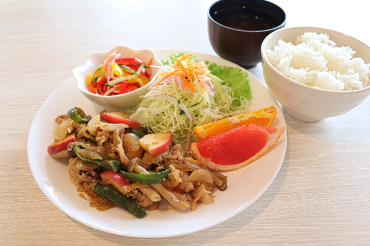 食環境栄養学科の学生が10月の果物であるりんごを使って開発したメニュー「豚肉ときのこのアップルジンジャーソテー」が、東谷山フルーツパーク レストハウスにて販売されます。