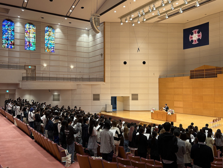 2025年10月23日(木)9時10分よりアニー・ランドルフ記念講堂において、感謝礼拝(実験動物を記念して)を行い、授業で動物実験を行う生活環境学部 食環境栄養学科および薬学部 薬学科の学生・教員342名が出席しました。