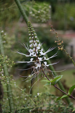 ネコノヒゲです。 めしべとおしべが猫の髭みたいだから、見たままのそのままのネーミングですね。 クミスクチンが本名で、葉は利尿を目的とした民間薬として用いられます。南の地方の植物で、インドネシアなどでは腎炎などの民間薬として用いられているそうです。シソ科の植物で、シソ科の特徴で茎が四角なのですが、その中でも特に角がハッキリした、エッジの効いた四角をしています。いつもの年だと、もうちょっと早い時期に花盛りですが、今年は暑さが長かったからか今ごろ花の最盛期です。