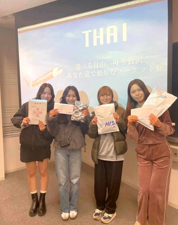 この科目はタイ国政府観光庁の方や、HISの現地支店の方からタイの魅力や課題を聞いたうえで、HISの現役社員の方から旅行プランの作成方法を学び、チームで旅行プランを企画する科目です。最終発表日にプレゼンテーションをして、最優秀賞を受賞したチーム(畑中海南さん、氷見朋葉さん、前田日和さん、山田小百合さん)が企画したプラン「選べる自由、叶う贅沢!あなた流で楽しむプーケット旅」が実際に商品化して販売されました。