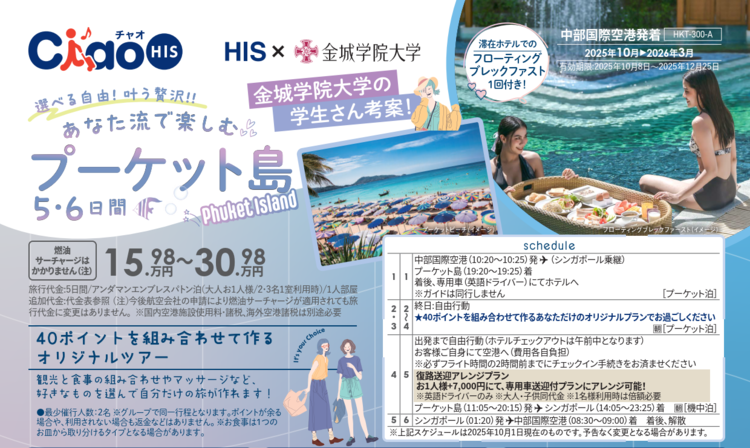 2024年度 株式会社HIS、タイ国政府観光庁との連携科目「キャリアプロジェクト」で学生たちが考案したタイへの旅行プランが2025年10月27日(月)より、HIS全店で販売中です。この旅行プランの特徴は「ポイント制」であること。限られたポイント内で、観光先や食事、マッサージなど、好きなものを組み合わせて、オリジナルな旅を作り上げるため、計画の段階から楽しむことができます。