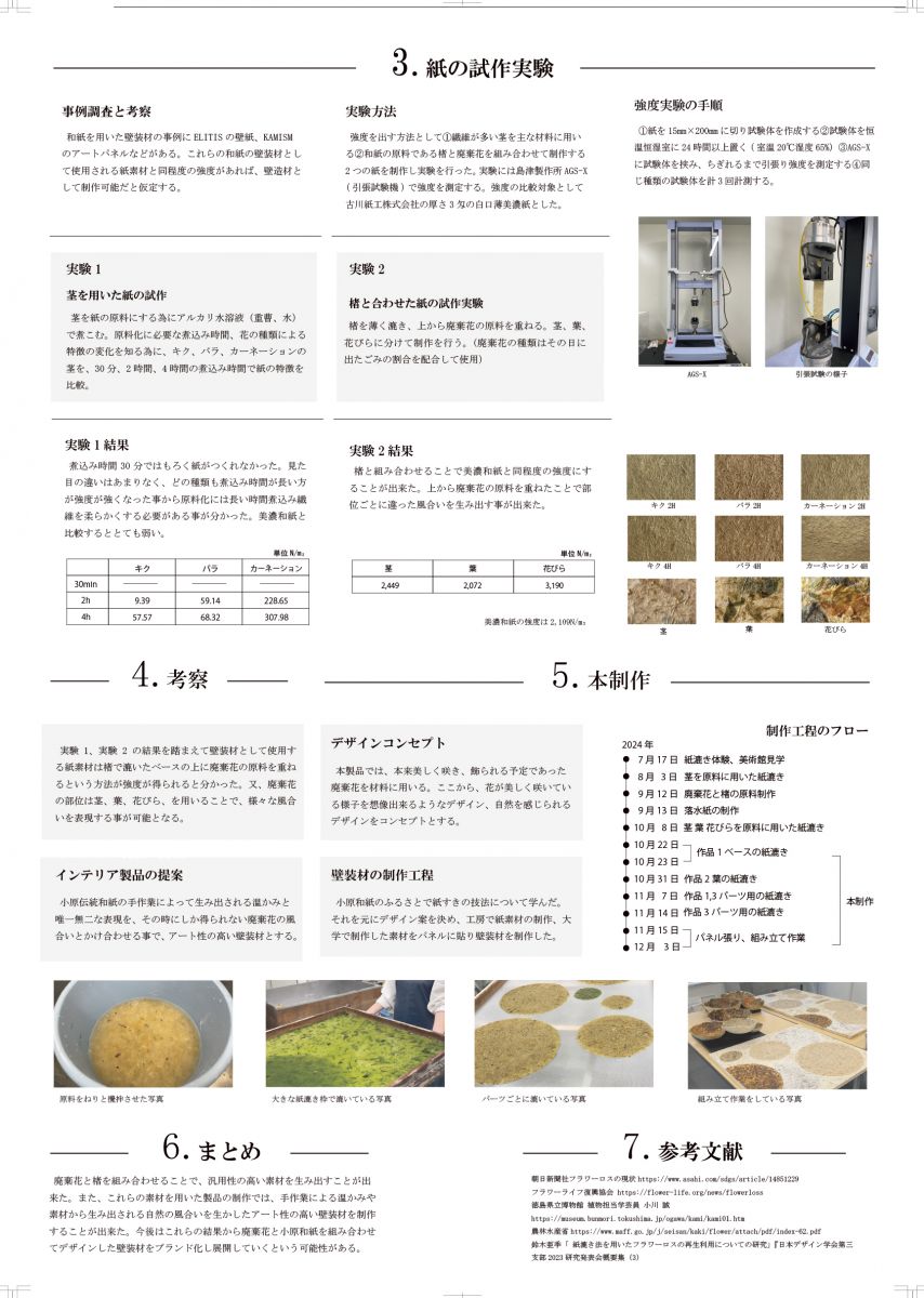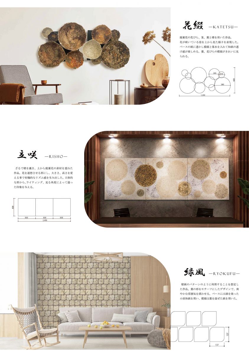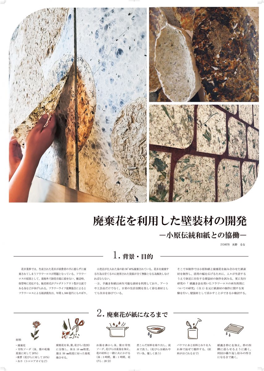 2024年度に卒業された光野るなさんの作品『廃棄花を利用した壁装材の開発』 が、日本インテリア学会 第32回卒業作品展 において 銅賞 を受賞しました。