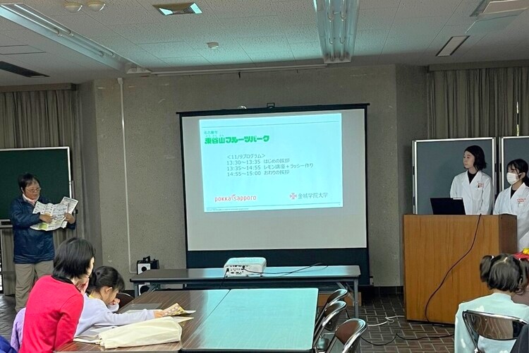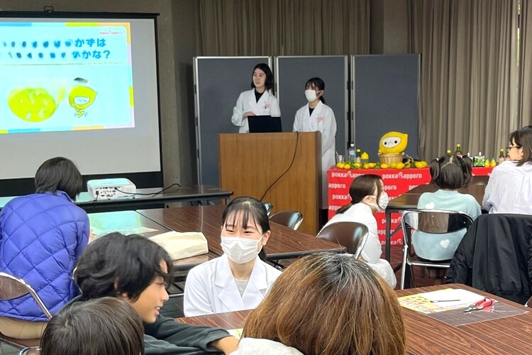 講座ではポッカレモンを使ったレモンのキレート作用を伝える実験を行いました。この講座に先立ち、講師を担当した3年生のIさんとMさんは、8月には経験豊富な4年生から食育講座の実践活動の場で講師としての態度や気配りなどの教えを受け、10月にはポッカサッポロの西川様から講師としての間のとり方などを伝授していただきました。