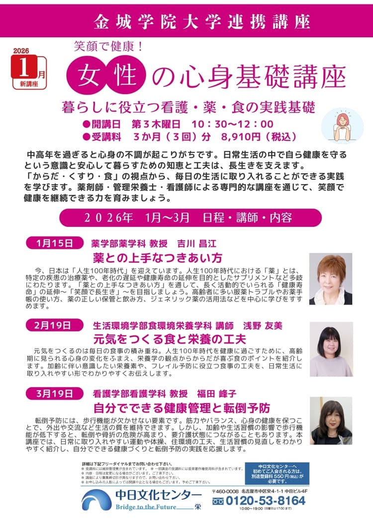 この度、金城学院大学は中日文化センターと連携して、今年度3回目となる【女性の心身基礎講座】を行うことになりました。