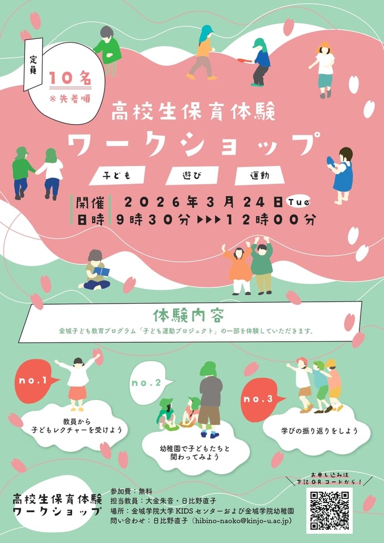 子ども・保育・遊びに関心をもつ高校生のみなさんが、実践的に学ぶことのできるプログラムとなっています。ぜひご参加ください。
