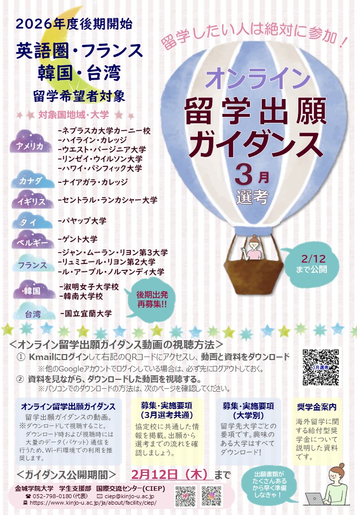 2026年度後期開始の留学生を決定する<3月選考>に向けた留学出願ガイダンスをKドライブにて公開開始しました。今回は、英語圏・フランスに加え、韓国と台湾も再募集します。
