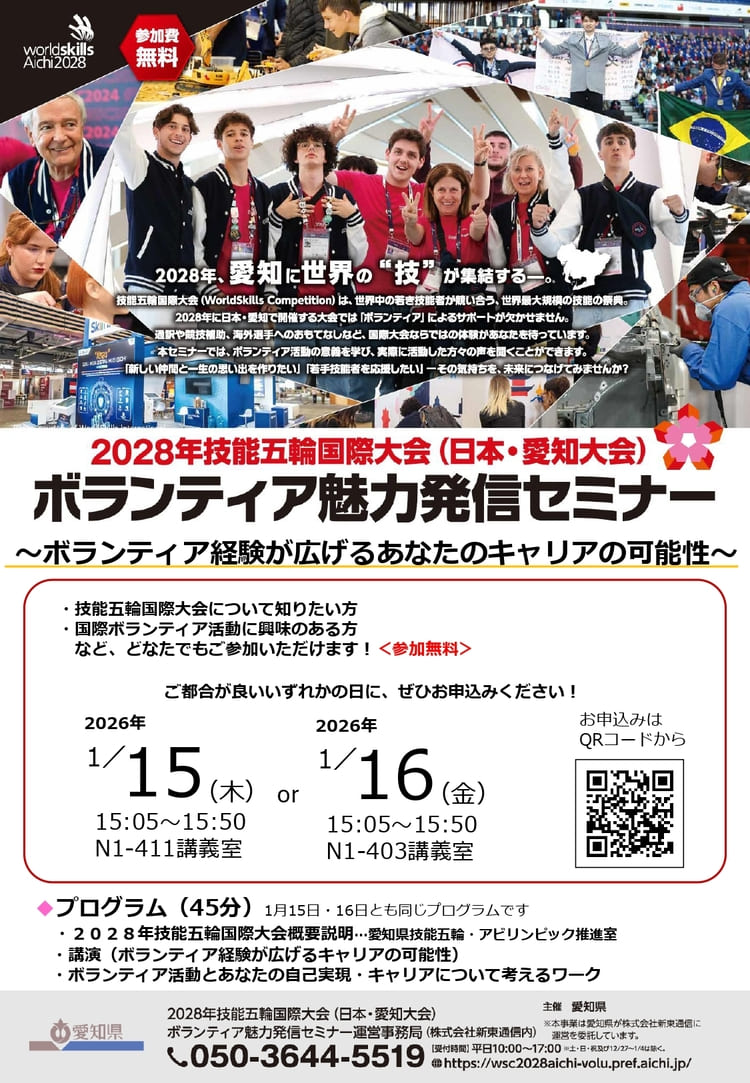 2026年1月15日(木)、16日(金)の2日間、本学にて2028年に愛知県で開催される「技能五輪国際大会」に向けた「ボランティア魅力発信セミナー」を開催しました。