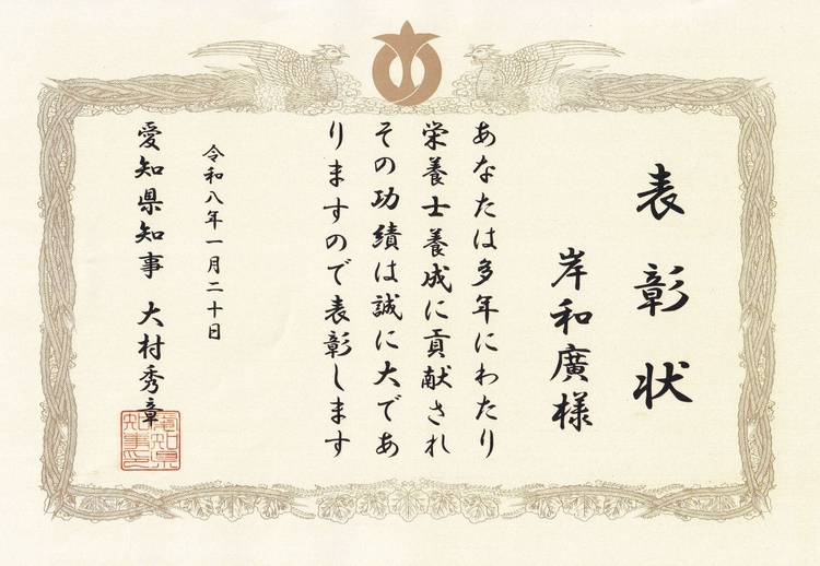 食環境栄養学科の岸和廣准教授が、令和7年度栄養関係功労者として愛知県から表彰されました。