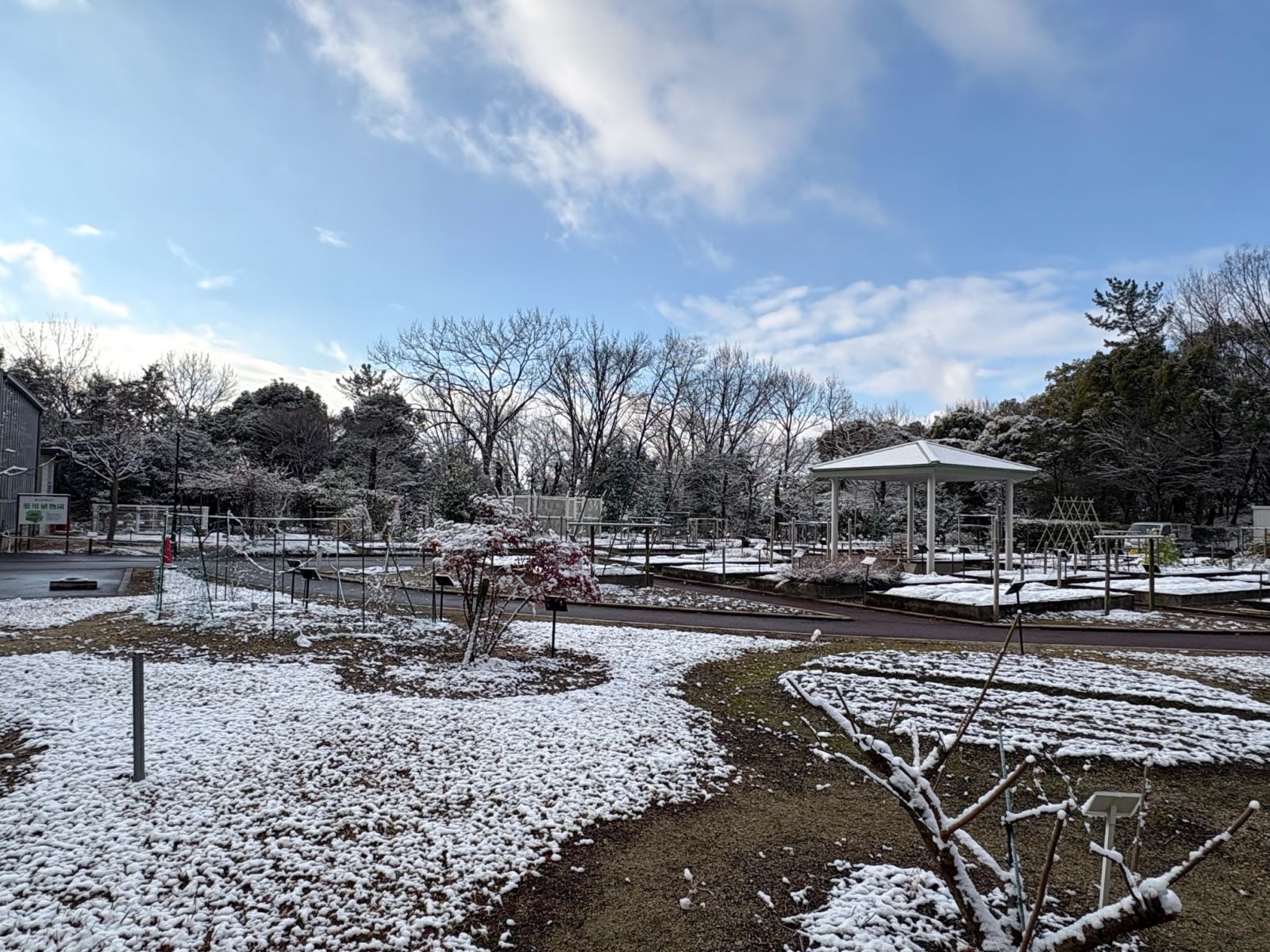 名古屋市内でもうっすらと雪が積もりました。薬用植物園も雪化粧です。