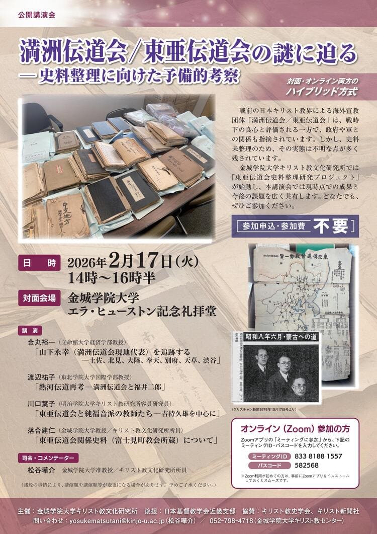 金城学院大学キリスト教文化研究所では「東亜伝道会史料整理研究プロジェクト」が始動し、本講演会では現時点での成果と今後の課題を広く共有します。どなたでもご参加ください。