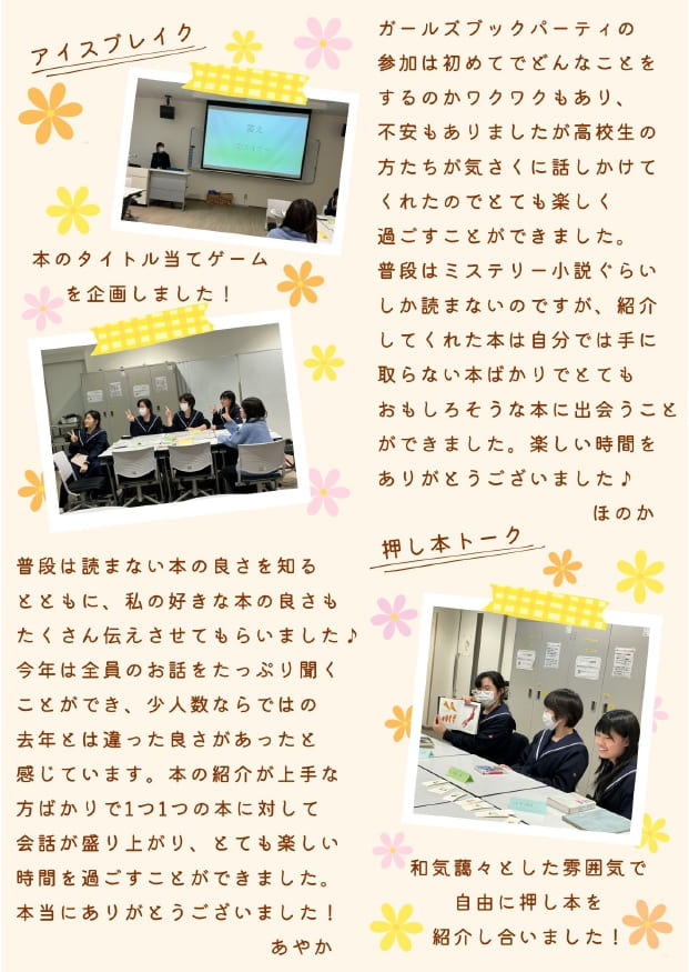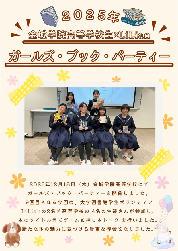 金城学院の高校生と大学生(図書館学生ボランティア LiLian)が、本を介して交流する「ガールズ・ブック・パーティ2025」を開催しました。 9回目となる今回も、ゲームや押し本の紹介など、和気あいあいと過ごしました。