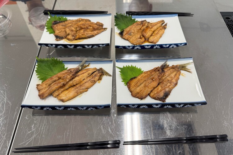 当日は、神谷様より魚の構造や調理技能に関してご指導いただいたのち、「鰯の蒲焼」の調理実習に取り組みました。栄養教諭や管理栄養士を目指す平田ゼミの学生と、家庭科教諭を目指す学生が協働し、実践的な学びを深める機会となりました。