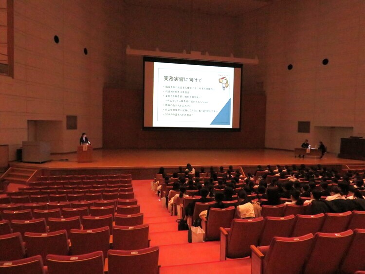 実務実習報告会は、すでに実務実習を終えた5年生の代表7名が、熱心な1~3年生、ホワイトコートセレモニー出席後の4年生及び5年生(Ⅳ期実習中の学生を除く)出席のもと、池田義明教授と高橋昌明教授の司会により執り行われました。