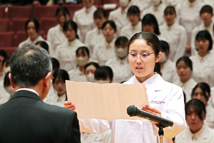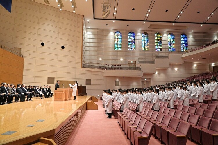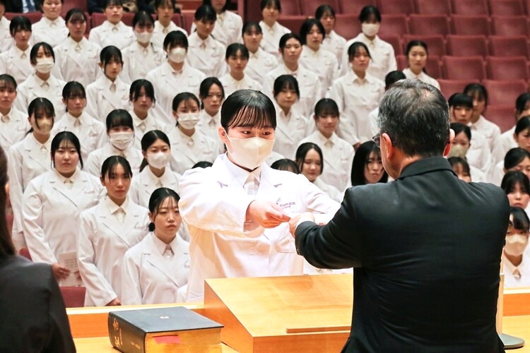 1月24日(土)に本学アニー・ランドルフ記念講堂にて、薬学部ホワイトコートセレモニーが挙行されました。 ホワイトコートセレモニーは、薬学共用試験に合格した4年生が、実務実習を受ける認証を授与され、医療人としての誓いを新たにする式典です。金城学院大学薬学部が全国の薬学部に先駆けて2008年から開催しています。 本学の校章が刺繍された新しい白衣が授与され、袖を通した学生は、医療に携わる者としての自覚と責任を再確認し、実習に真摯に取り組むことを宣誓しました。
