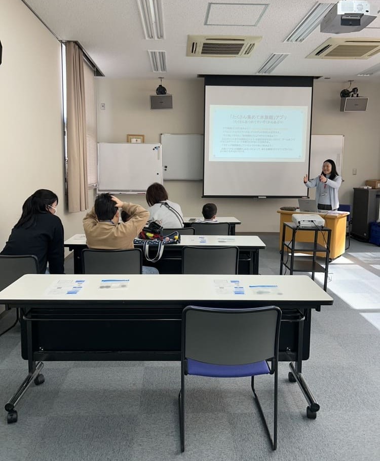 講座では開発した教材用のオンラインゲーム「たくさん集めて水族館」の無料ゲームを体験した後、課金をしてゲームを続けるか、他の物を買うか、決められた額のおこづかいをどのように使うかについて考えました。遊びながら、楽しくお金について学んでいただきました。