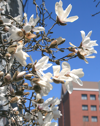下右の写真は大学の最寄駅からの通学路にある街路樹のシデコブシ。こちらはもっと咲き誇っていますね。東海地区の固有種で準絶滅危惧種だそうな。これの蕾は生薬にはしません。