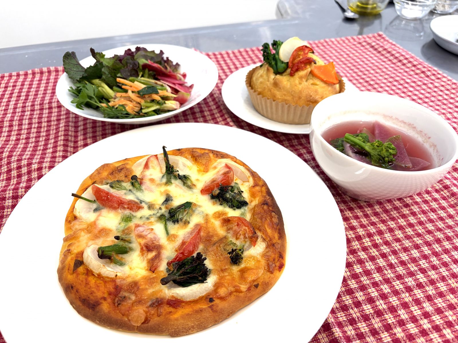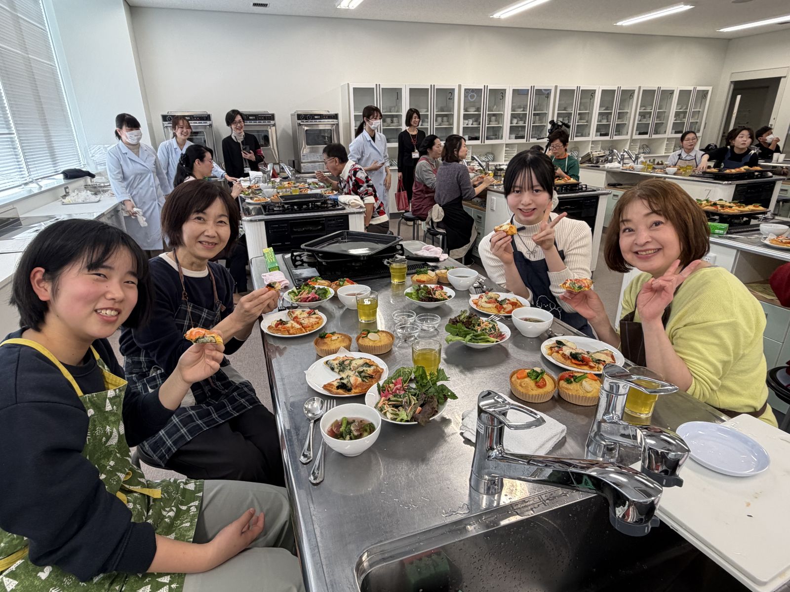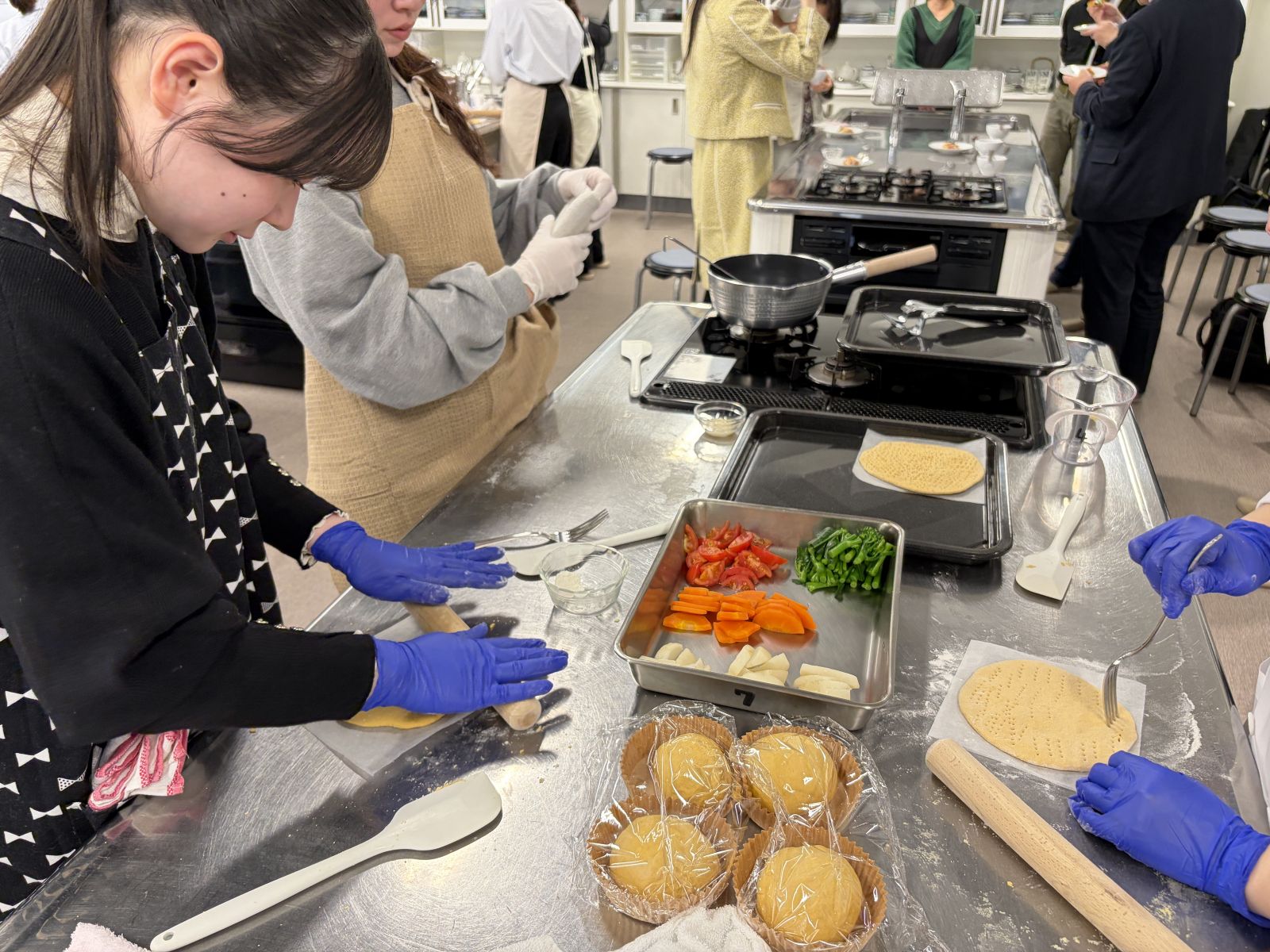 また同日、キャンパス内にある調理学実習室では、在学生や地域住民の皆さまを対象に、「地産地消」や「有機野菜」への理解を深めることを目的としたパン作り講座を開催しました。講座では、愛知県産の強力粉「ゆめあかり」や米粉、東海農政局よりご紹介いただいた自然栽培農園「つむぎて農園」(大府市)の有機野菜を使用し、ピザやフォカッチャ、大根と春菊の塩麹スープを作りました。