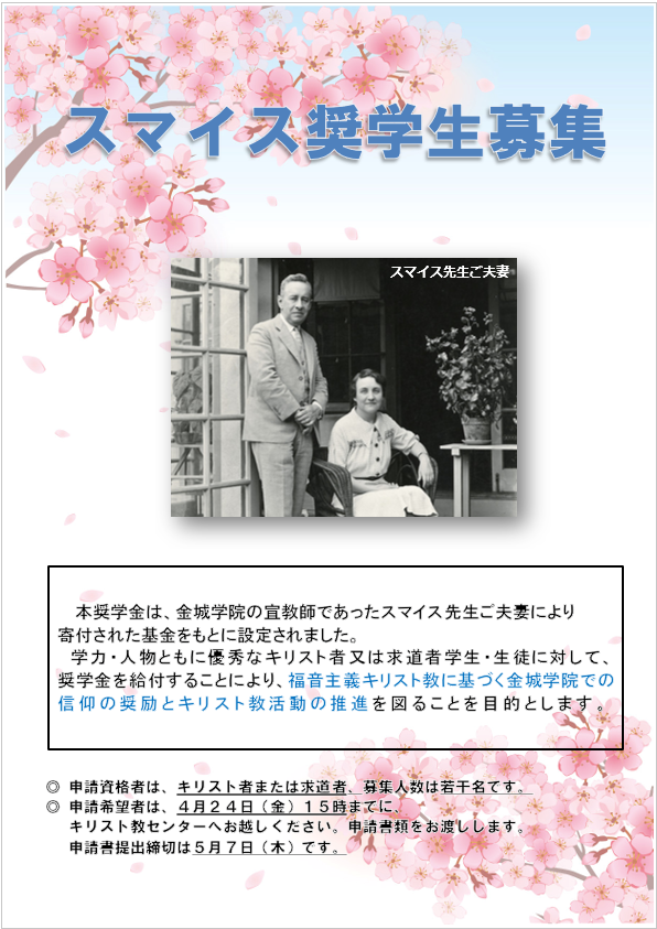 スマイス奨学生の募集を開始します。 申請希望者は4月24日(金)15時までにキリスト教センターへお越しください。 申請書類をお渡しいたします。