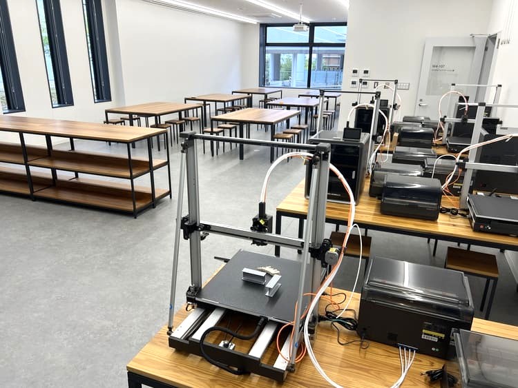 ファブスタジオは建築デザイン学科の専用施設として、3Dプリンタ、レーザーカッター、CNCルータ、Rhinoceros(ライノセラス)などのデジタル機器を活用し、設計・制作・検証を往還する学びを支えるデジタルファブリケーション拠点です。設計から試作・検証までを一体的に行う実践的な教育を推進するとともに、地域や産業界との連携も視野に入れた活用が予定されています。