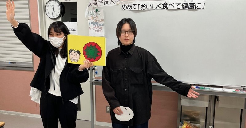 丸山ゼミの東谷山フルーツパーク食育チームリーダー 3年生 TとMです。10月中旬ごろから、食育講座の指導案の完成と並行して指導媒体を作成。食育チーム7名で協力し媒体の完成度を高めました。栄養教育論で学んだ指導媒体作成技術を活かして、手作りで作成中
