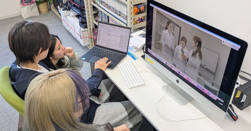 大学公式プロモーションビデオ企画・撮影担当の川瀬加奈(国際情報学科3年)、森愛華(国際情報学科1年)、服部暖加(国際情報学科2年)、大石彩葉(国際情報学科1年)です!今日は編集室の撮影をしました。モニターに映っているのは、金城プロダクションで編集している動画です。