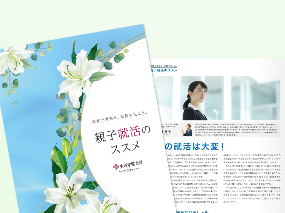 キャリア教育や就活支援、各種講座を通じて制度的に学生の未来を後押しし、親子で安心して進路を考えられるようパンフレットもご用意しています。