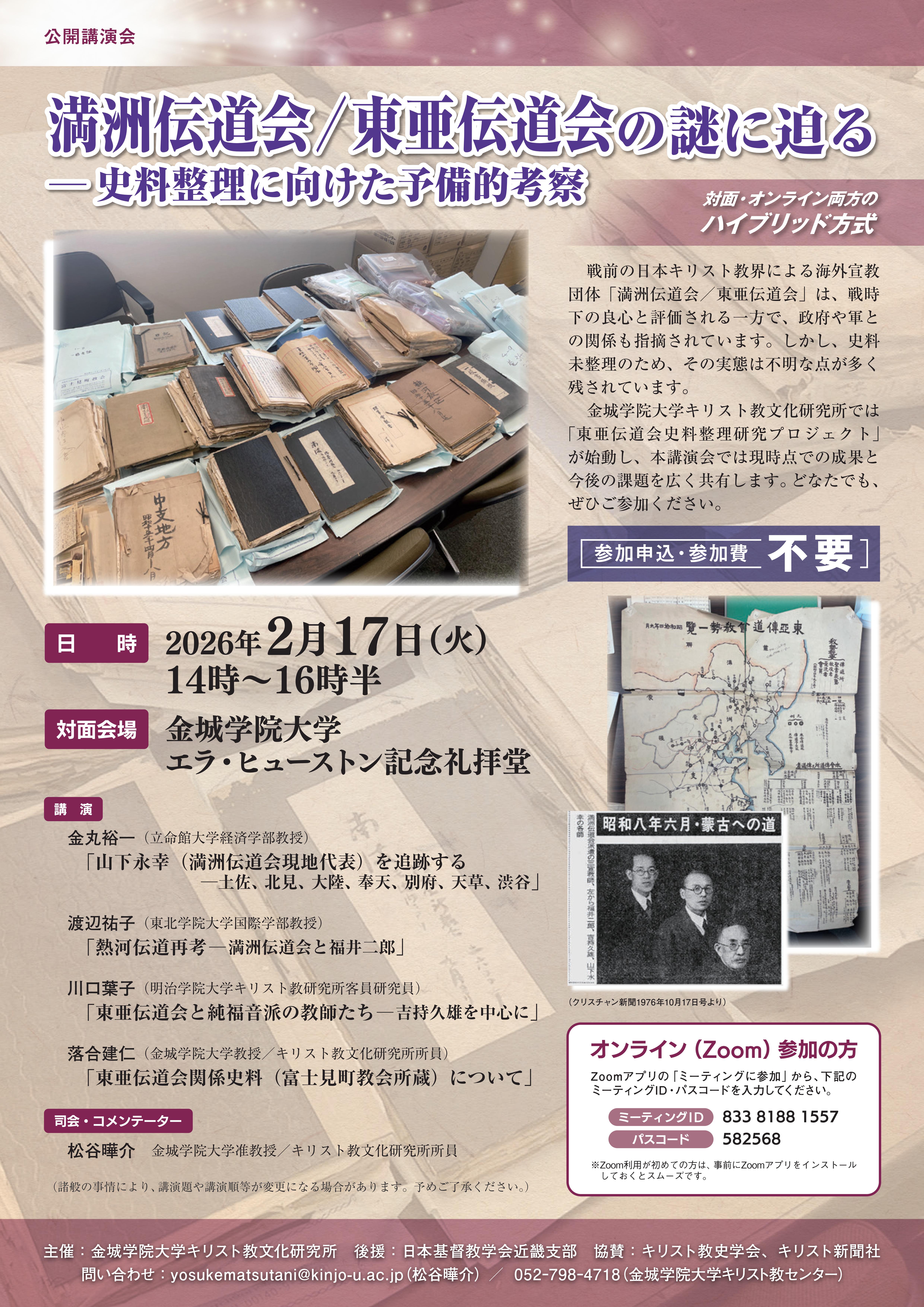 ■2026年2月17日(火)に公開講演会「満洲伝道会/東亜伝道会の謎に迫る:史料整理に向けた予備的考察」(ハイブリッド開催)が行われます。ご参加をお待ちしております。